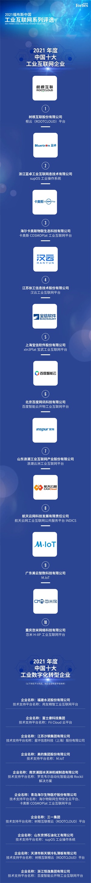 就在今日,“2021福布斯中国工业互联网系列评选”结果重磅发布。福布斯中国官方称,这是福布斯中国首次举办工业互联网行业评选,并首次深入到制造业数字化转型的案例中,本次榜单目的是为了更好地理解,在《“十四五”规划》工业互联网和数字化转型的背景下,为工业互联网、制造业高质量发展树立标杆示范,最终评选出了“2021年度中国十大工业互联网企业”和“2021年度中国十大工业数字化转型企业”。