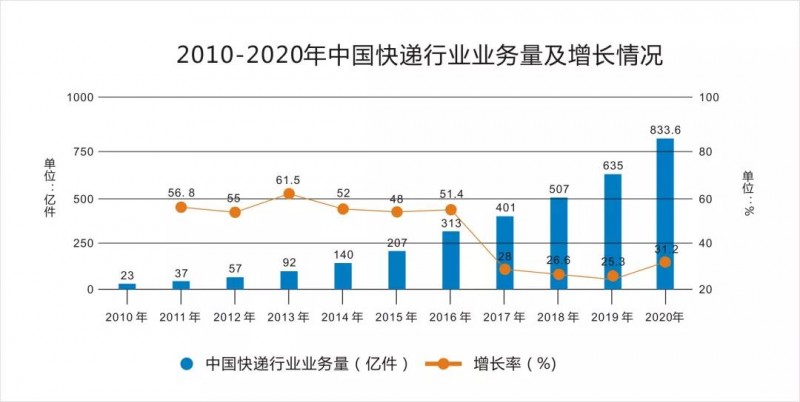图表:2010-2020年中国快递业业务量及增长情况