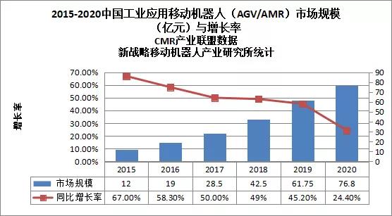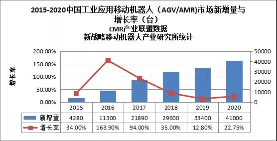 根据中国移动机器人(AGV)产业联盟、新战略移动机器人产业研究所的调研,2020年度中国市场新增工业应用移动机器人(AGV/AMR)41000台,较2019年增长25.7%,市场销售额达到76.8亿元,同比增长24.4%。由此可见,2020年国内移动机器人行业尽管受到了疫情的影响,仍然保持了较好的整体增长态势。
