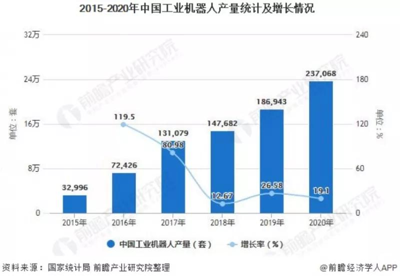 2015-2020年工业机器人产量保持着增长的趋势,截至2020年12月中国工业机器人的产量从2015年的32996套增加到237068套。但是从增速变化来看,这期间工业机器人的增速放缓明显,2015-2016年增速为119.5%,次年便降低到了12.67%,最近的增长速度仅有19.1%,但仍处于较高的水平。