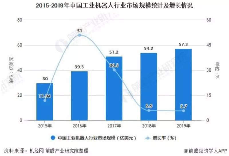 工业智能化对工业机器人的需求日益增加,工业机器人的市场规模逐年增加, 2019年我国工业机器人的市场规模已经达到了57.3亿美元。市场规模的增速则先上升后下降,但仍保持向上的势头,预计在未来还有更高的上升空间。
