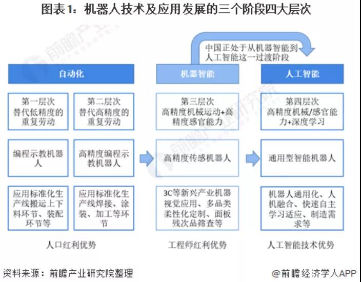 机器人技术及应用发展可分为三个阶段四大层次,三个阶段发展的关键因素分别是人口红利因素、工程师红利优势和人工智能技术优势等。