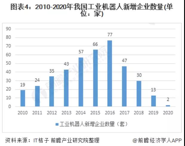 受下游应用领域需求的驱动工业机器人企业总数不断增加,但随着行业竞争格局初步显现及进入门槛的提升,新增企业数量减少,2020年行业新增企业仅为2家。